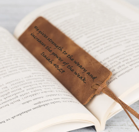 Classic bookmark style, with an elevated twist thanks to the custom quote on a leather backdrop! A beautiful choice for any reader!