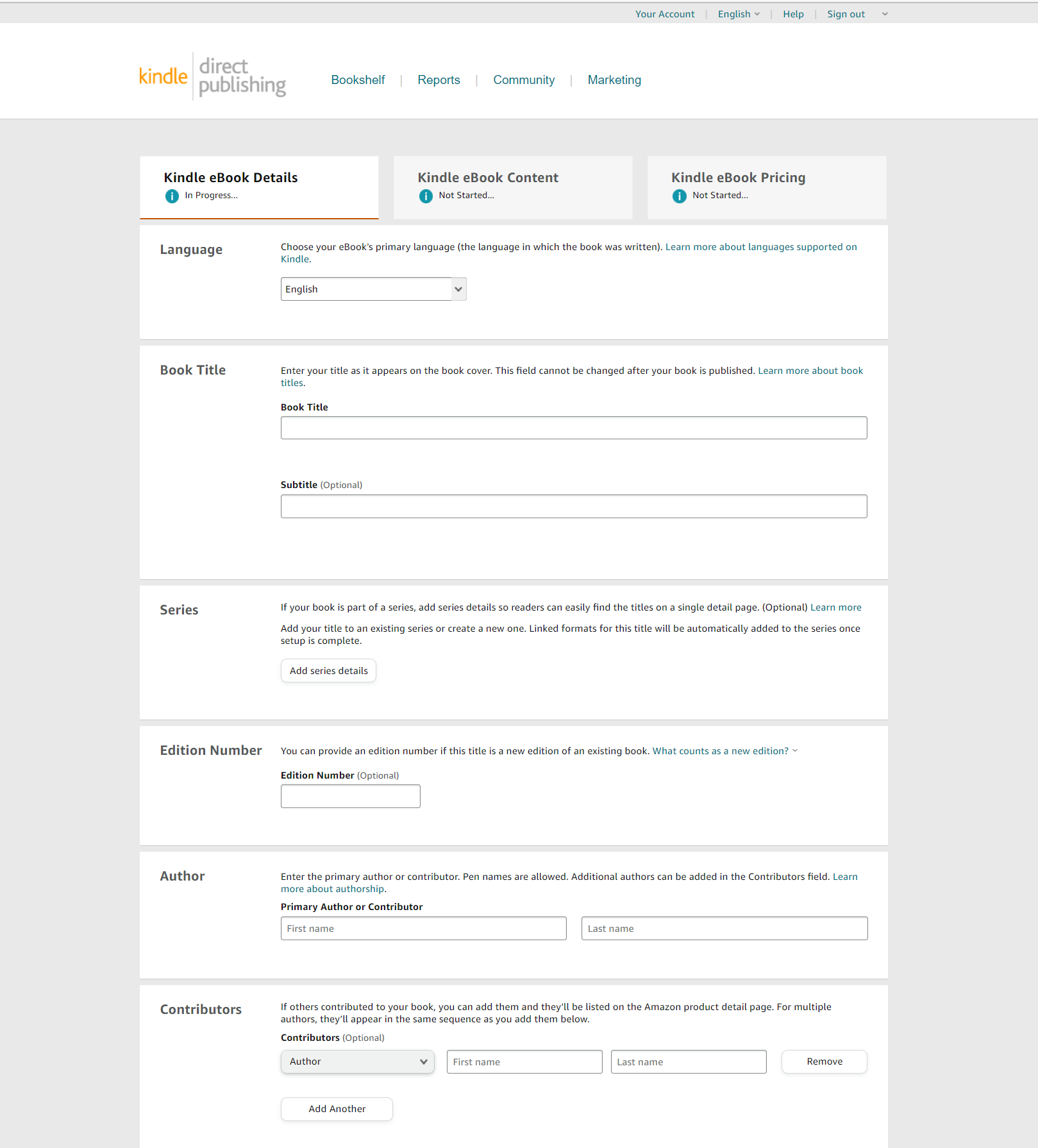 You’ll fill in the different boxes, but none of them have to be perfect. Your title (until published) can be altered, so don’t worry if you don’t have it perfect yet. Just put something in here if you’re undecided on what you want it to be.