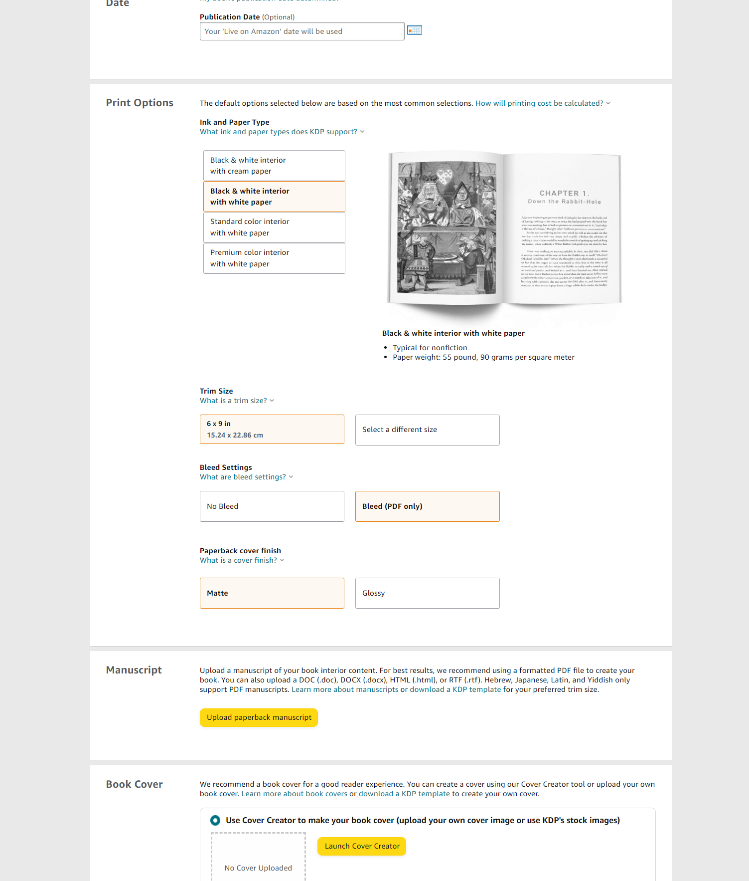 Next are your printing options. For this, I recommend checking books you own for what style you like best. This section can be changed though, so you can try a format and then change it later if you don’t like it. I always go with 6x9 because I think it’s the easiest to grip when reading, but choose whichever format suits you. I recommend considering how long your book is though, because it will be impacted by the size of the book.