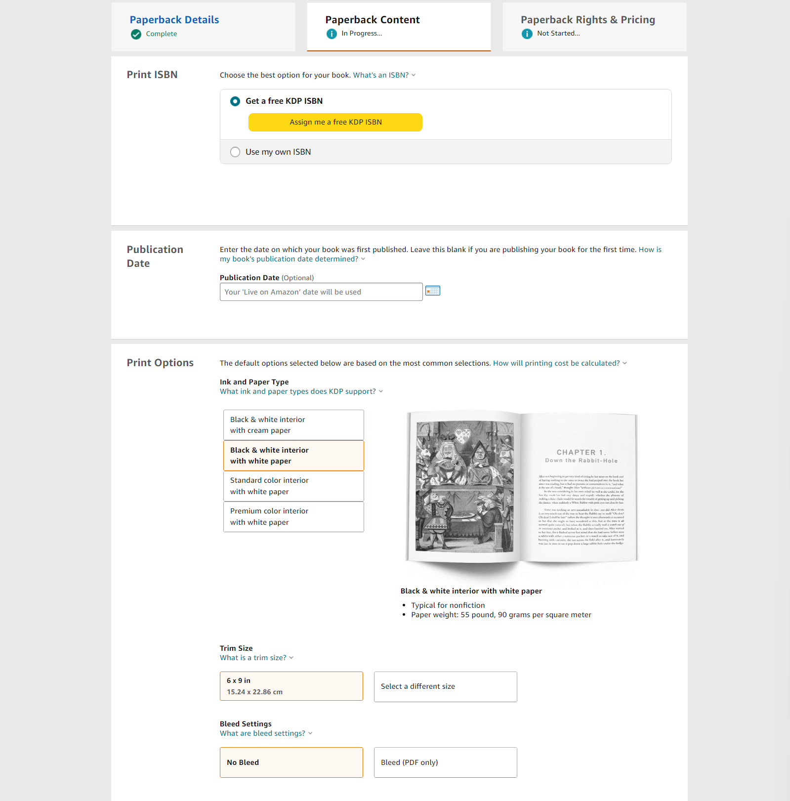 The rest of the process is very similar, except that you do not choose a print size or order a proof copy. However, for both physical books and eBooks, you can change the content or descriptions up until publication, and you can even change it after publication. Though changing the content of the book after publication is tricky, because Amazon will claim that they need to sell all previously printed copies before selling updated ones, so be warned.