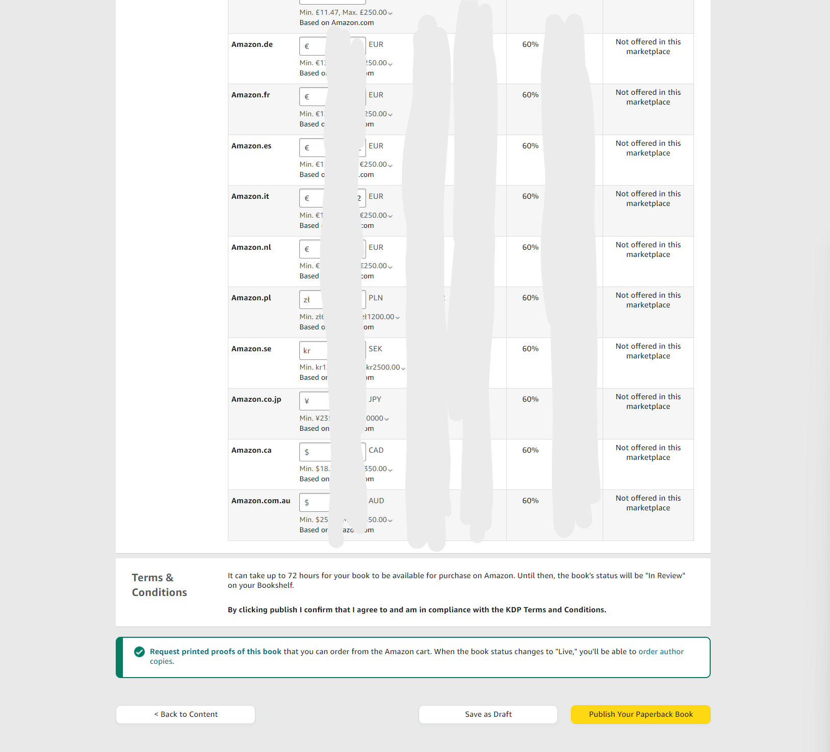 Once you’ve gone this far, you can do a few things. You can save as draft, which saves all your changes to your bookshelf where all your books (published and unpublished) are catalogued for you, you can publish your paperback if you’re ready, and it will be available to shoppers as soon as Amazon approves it, or you can request printed proofs.
