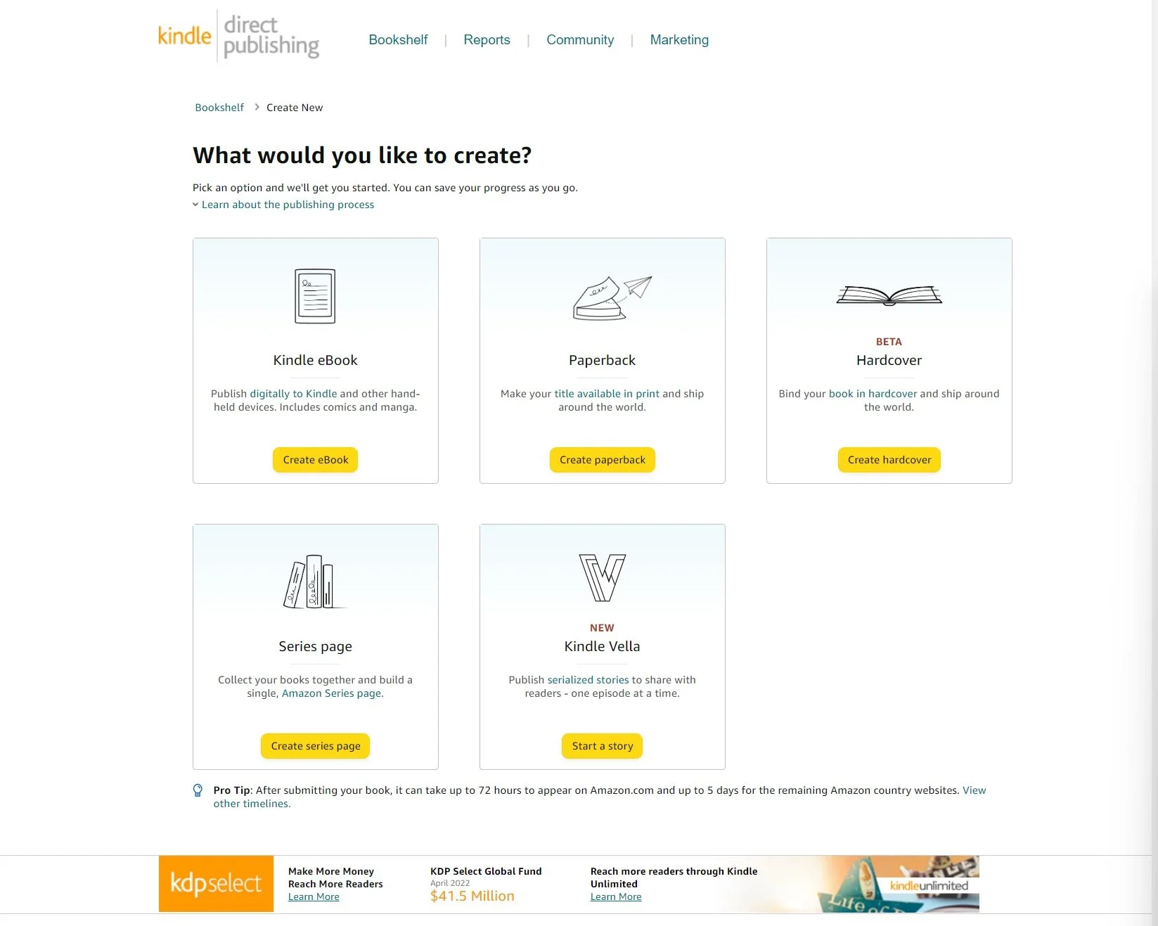 Next, you’ll come to this screen. Now, don’t freak out here. You don’t have to commit to just one book format. You just need to start with one. I’ll start with a paperback so you can see that process, but you can choose any of them, and you can add more formats to the same title later by just following the prompts under your book on the Bookshelf page once you’ve started the setup for at least one format. Ex: if you start the paperback set up and then save what you have done so far, it’ll show up on your Bookshelf. Next to it will be options to start creating other formats of that book. So don’t worry, you’ll get opportunities to do more.