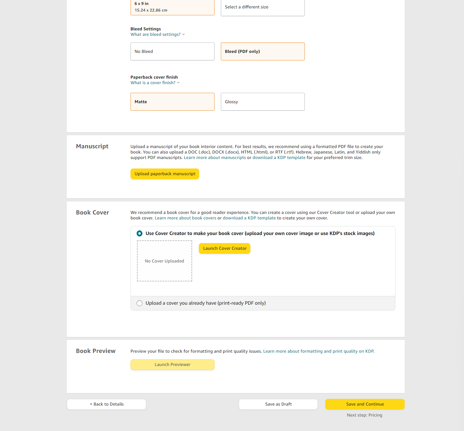 Once you’ve uploaded your manuscript, you have two cover options, either you can create your own using something like Canva (or Paint.NET if you’re old school like me) and upload a PDF version of that cover to Amazon, or you can use the cover creator shown on here as an option. If you choose to make your own cover, there is a cover calculator you can use that will give you a template for your cover.