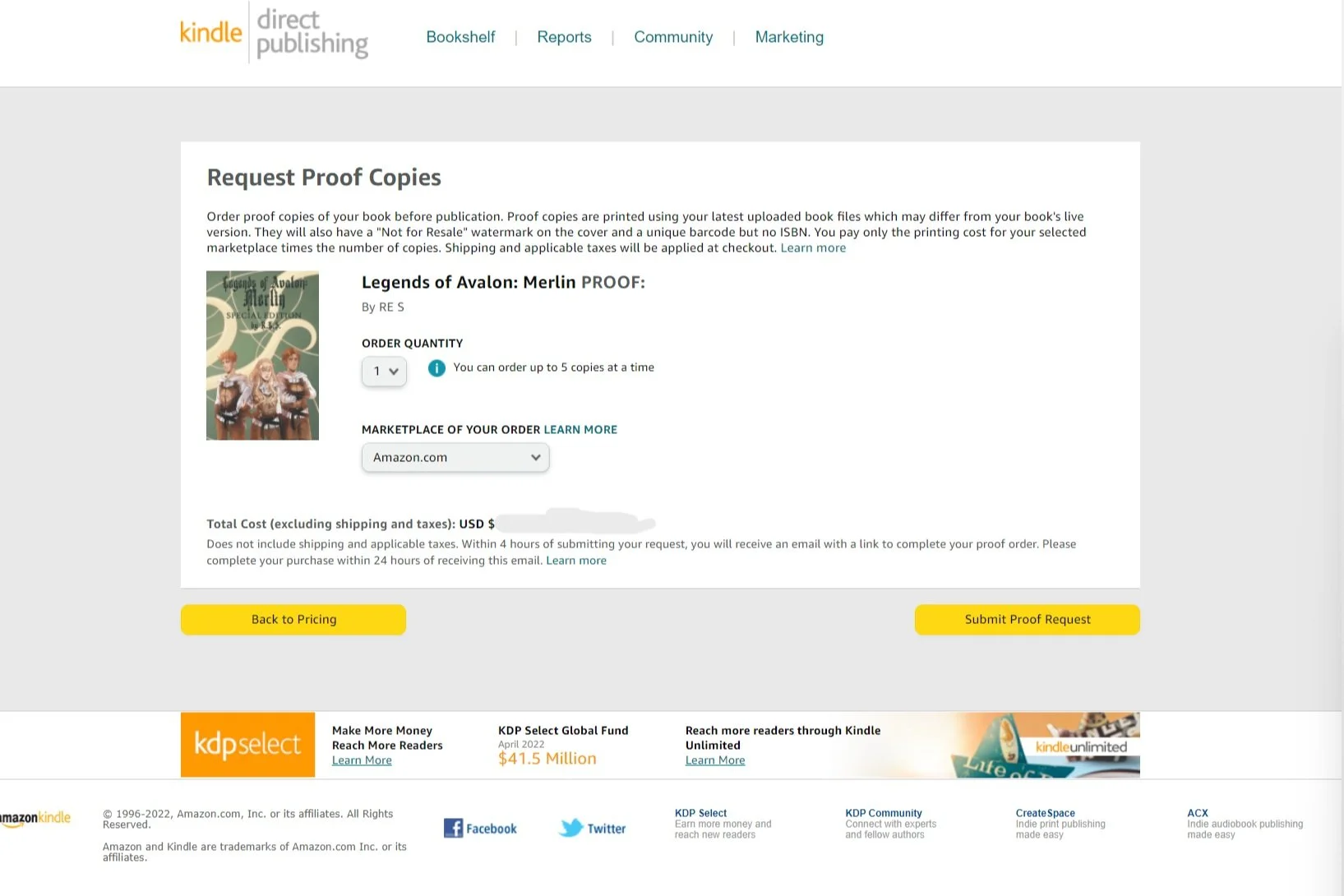 If you want to request a proof, you’ll click on the link and, after saving your progress when prompted, you’ll go here. On this page, you can decide how many proof copies you want to order—you can order no more than 5 at a time—and Amazon will tell you how much each proof will cost you. Then you can submit your proof request.