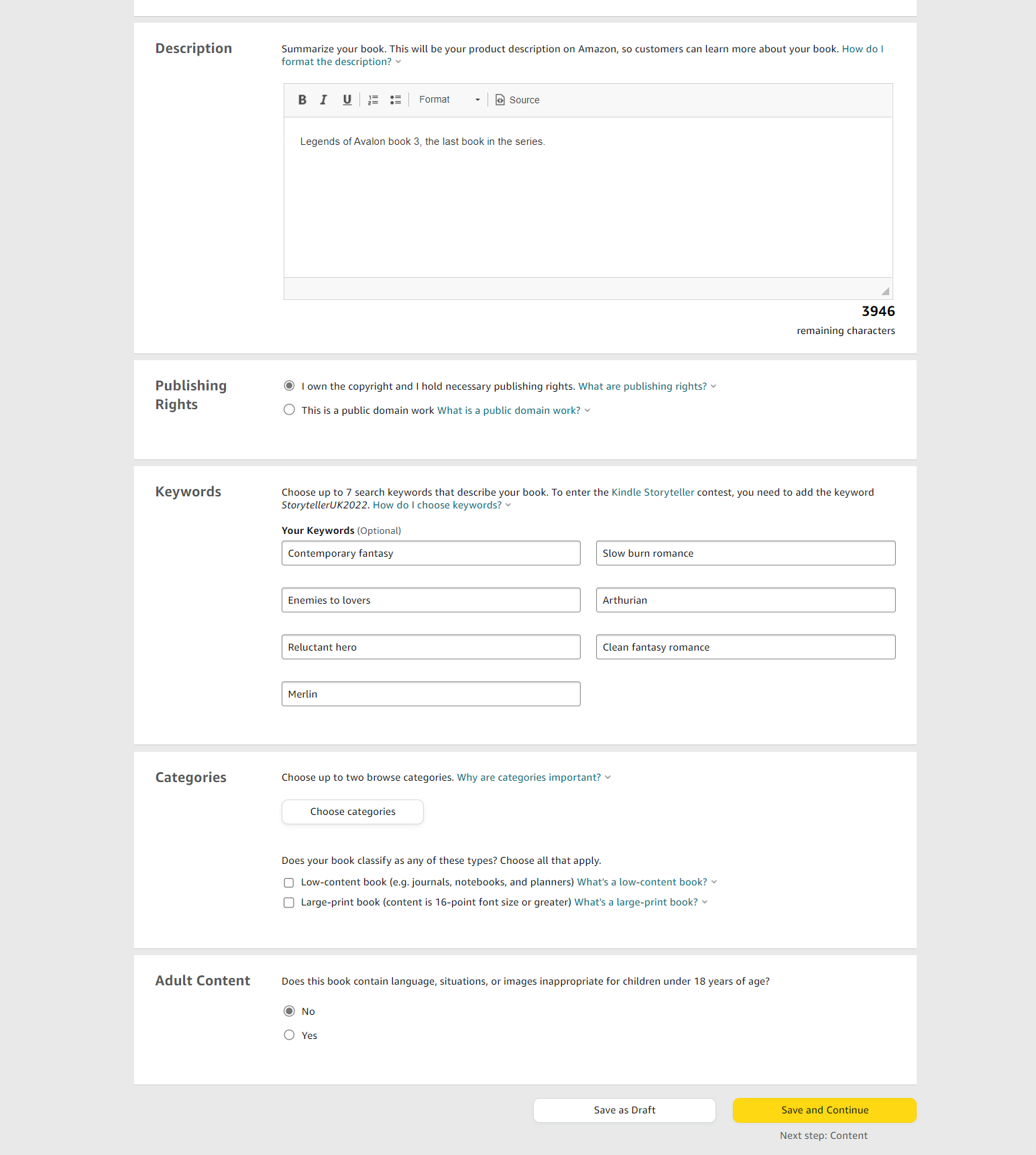 Next are your keywords. These are the words that Amazon will use to show your books to people shopping. There are lots of websites you can use to help you choose them, but it’s honestly a roll of the dice to choose ones that work well (these can be changed even after publication, so chill out). For me, I’ll just use the same words I used on the previous books in this series. I’m sure there are other people who know more about choosing keywords, but I based mine on tropes and categories my book fits into.