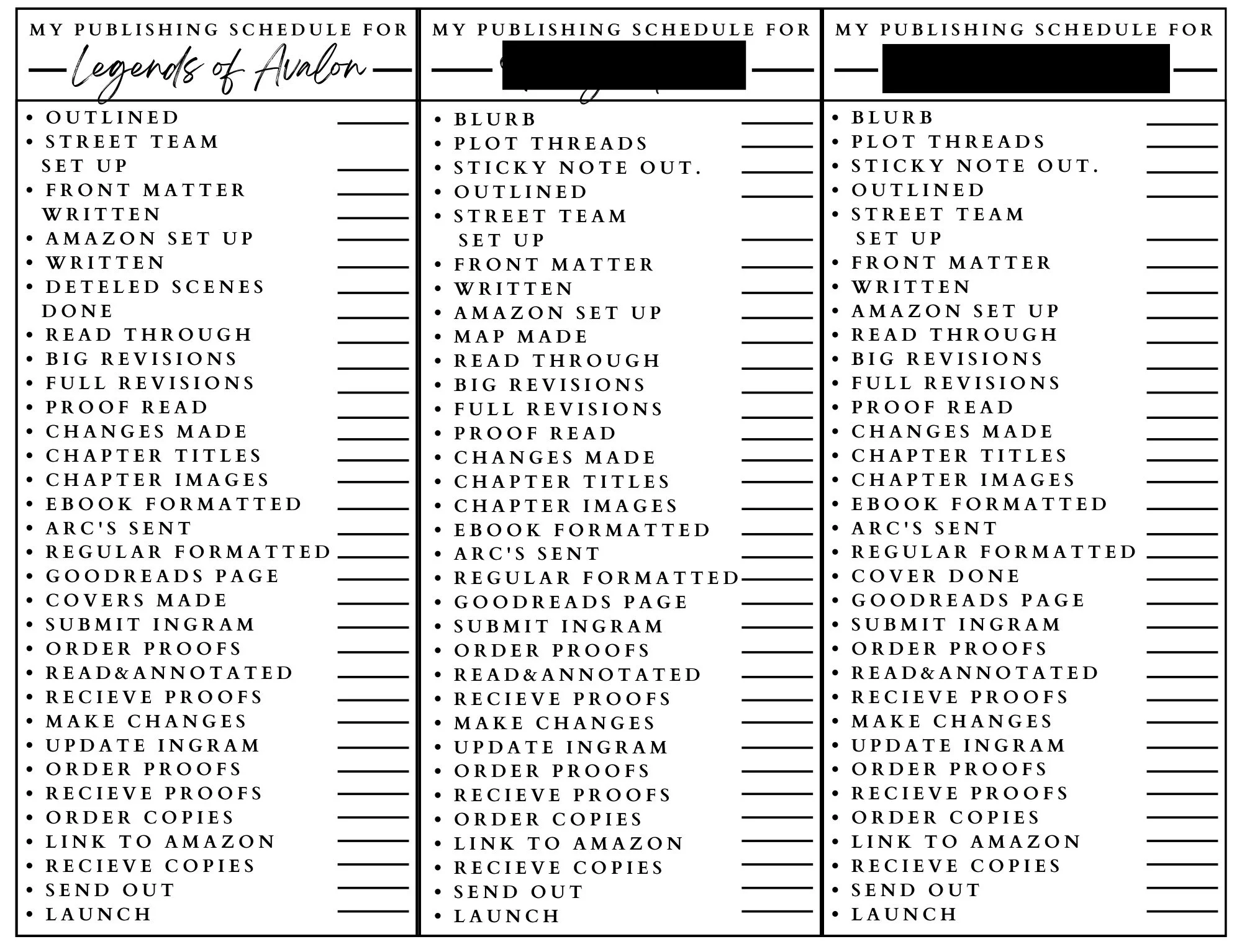 130,000/4,000=32. Which means my new book will have about 32 scenes. This tells me how long the outlining process will likely take and how long the actual writing process and revision process will likely take, and then I can make a list of all the pieces of the writing and publishing process for each book, and the estimated dates I think I can complete them by. Which looks like this 👇